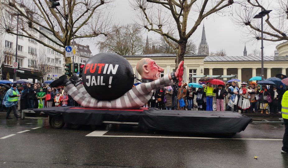 On y voyait Vladimir Poutine représenté en prisonnier, traînant un boulet marqué “Putin Jail”.